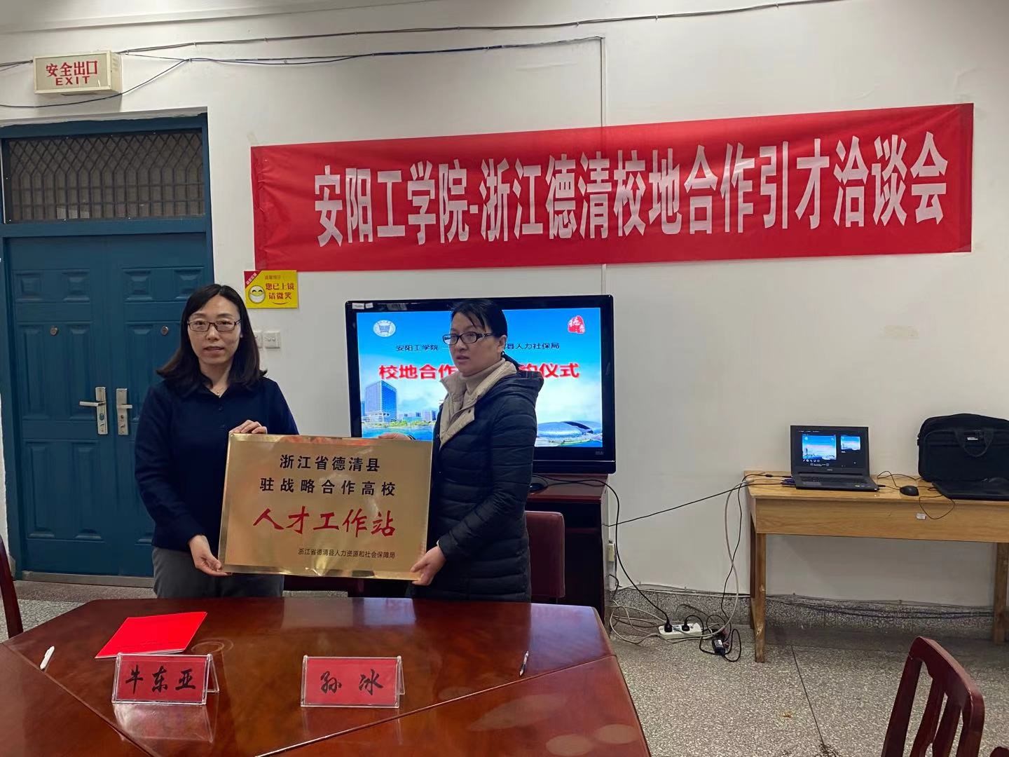 会后双方签订了校地战略合作协议,孙冰副局长向我校颁发“浙江省德清县驻战略合作高校人才工作站”牌匾,双方正式建立校地合作关系。