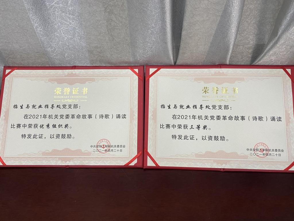 比赛前夕,招生与就业指导处党支部高度重视,认真组织党员干部参赛并进行节目排练。比赛过程中,招生与就业指导处党支部代表队服装整洁、精神抖擞,满怀深情地诵读革命诗歌《党史领航中国梦》,使现场观众深受感染、倍感振奋,得到了评委及观众的一致好评,最终荣获三等奖和优秀组织奖两项奖项。