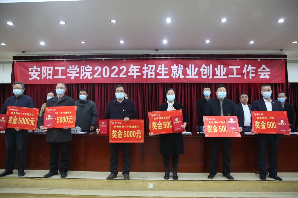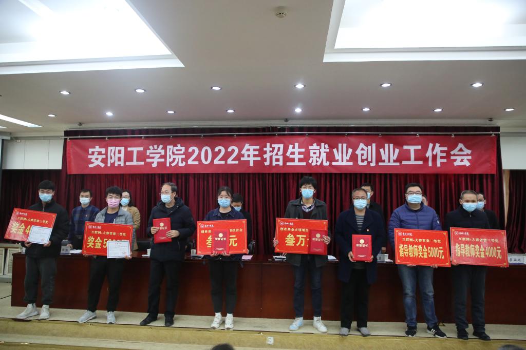 会议听取了招生与就业指导处处长牛东亚关于2021年度招生就业创业工作的报告,学生工作处副处长邵国强宣读《安阳工学院关于表彰2021年度就业创业先进集体和先进个人的决定》,创业中心主任姜建平宣读《安阳工学院“互联网+”大学生创新创业大赛实施方案》及2021年度省赛以上获奖名单,科研处处长张勇宣读《2020年度、2021年度创业基金评审结果》,与会领导为2021年度就业创业工作先进集体、先进个人、创业基金及“互联网+”大赛获奖人员代表颁发了奖牌和证书。先进集体代表会计学院副院长史建军、先进个人代表熊思彬、李立依次进行了交流发言。