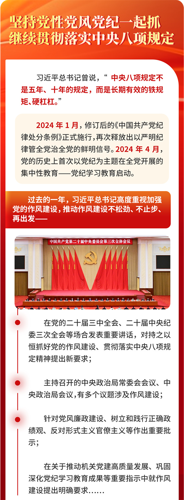 在二十届中央纪委四次全会上,习近平总书记强调:“把中央八项规定作为铁规矩、硬杠杠,严肃查处顶风违纪、隐形变异的‘四风’问题,督促党员、干部坚决反对特权思想和特权现象,树牢正确权力观、政绩观、事业观。”
